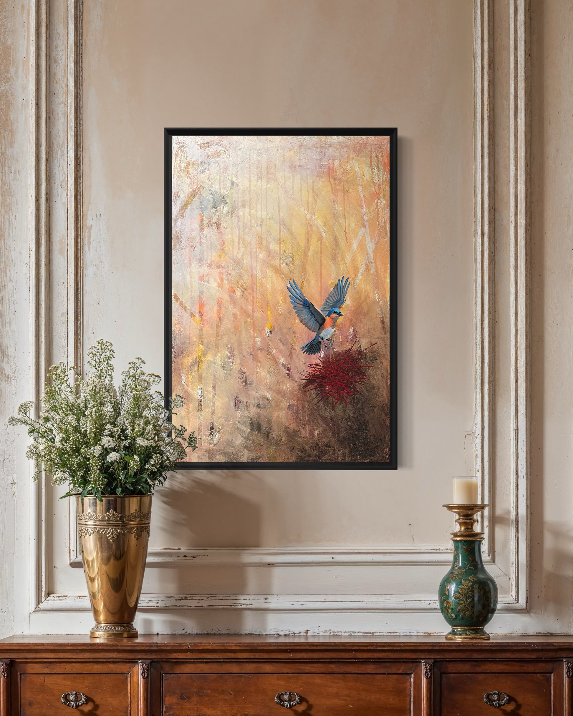 This striking art piece captures a mother bluebird coming home to her nest. The contrast of fine detail and expressive texture draws the eye instantly, creating a sense of movement and emotional uplift. A captivating centerpiece that adds both energy and elegance to any space.